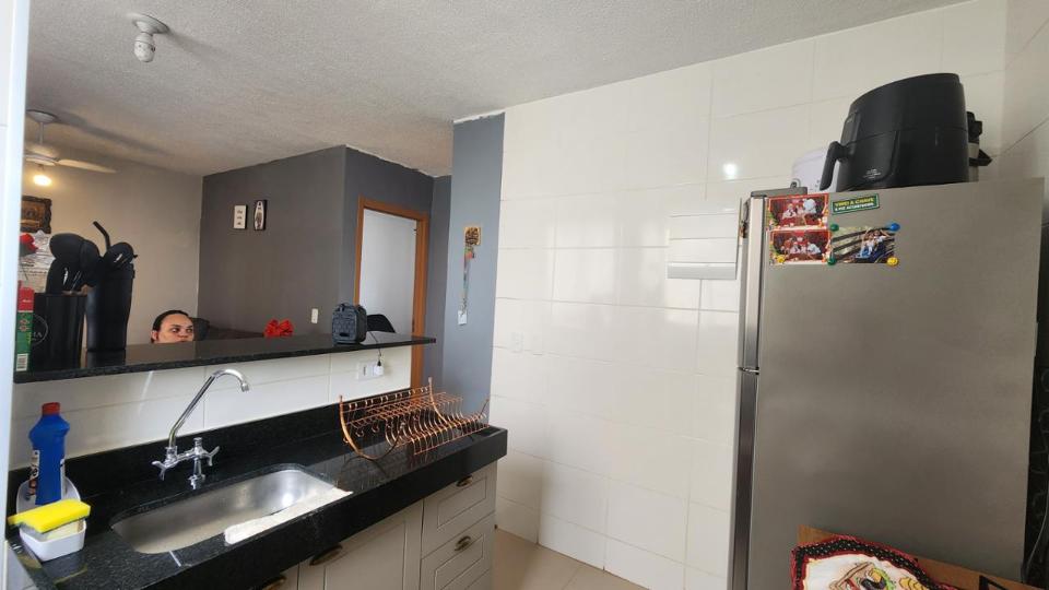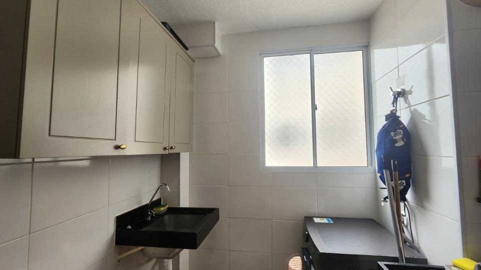sala para dois ambientes, cozinha rica em armários e lavanderia. Inclui uma